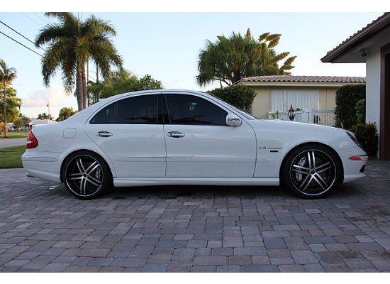 This car has EVERY option Mercedes offered in 2005. Charcoal & Merlot leather. Look closely at interior pictures. Heated and cooled front seats. Massager front seats option. Seats also hug and couture to your body when turning the car. Really cool feature. Distronic $3070.00 Has to do with controlling distance while using cruise control Parktronic $1008.00 Distance both front and rear when parking. Alerts if you are getting too close to an object. Rear Window roller blinds $340.00 Panorama Sunroof $1560.00 This is a MUST have! Navigation $1220.00 Power rear window sunshade $460.00 6 disc changer $420.00 Electronic Truck Closer $500.00 Keyless Go $1060.00 Another MUST have option. Allows you to keep the key in your pocket, open and start car without ever removing key from pocket or purse. Comfort Package $1650.00 Lighting Package $1200.00 Car just has too many options to list (see picture of window sticker) for all additional options. The first owner was a neighbor of mine. Car was and is ALWAYS kept in an A/C garage. Non-Smoker. This E55 was purchased New in October 2005 at Mercedes of Pompano in Florida for $105,150. I purchased the car in January of 2008 with 17,200 miles. Cars current mileage is 37,640. Very tough to sell this car, it drives like a dream and is VERY fast. Car has some tuning work done by Renntech, supercharger pulley upgrade and complete performance tuning. Car makes over 500 hp. If you have never driven one of these, I guarantee its performance will surprise you!!! As you can see from pictures car has 20 rims, these were purchased in 2010. Tires are Pirelli P-Zero Nero 275-40-20 rear & 245-45-20 fronts. This car still looks like a $100k car, it will turn heads.